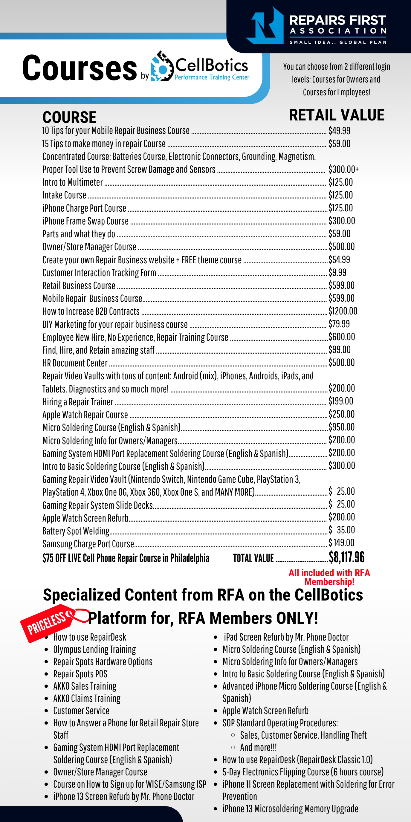 100% Access for you and your staff to the industry's largest online training platform, CellBotics & RFA. Have more than 10 locations, CellBotics will whitelabel it for NO EXTRA COST (RFA Members only)